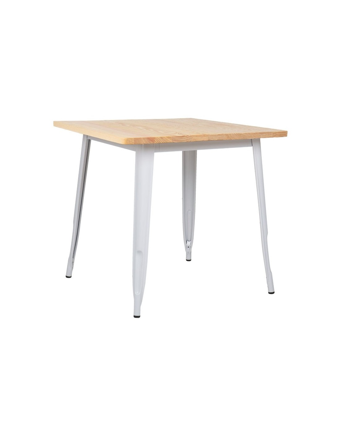 Su diseño es ideal para adaptarse a cualquier tipo de ambiente interior, ya sea un bar, restaurante, o un hogar moderno. Esta mesa combina un robusto tablero de madera de pino con una estructura de acero soldado, creando un equilibrio perfecto entre durabilidad y elegancia.
