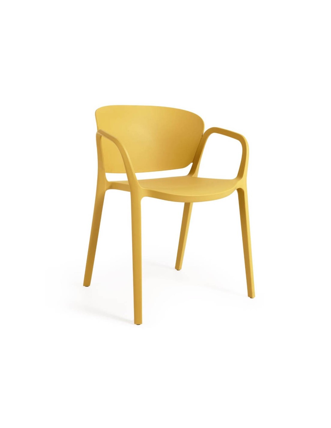 Su diseño apilable proporciona practicidad al permitir guardarlos sin ocupar mucho espacio. Con dimensiones de 60 cm de ancho, 55 cm de fondo y 76 cm de altura, este sillón amarillo de polipropileno pesa 5,85 kg.