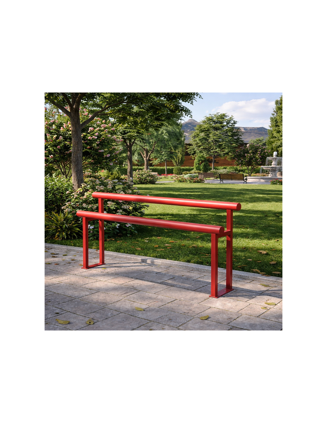 Banco de apoyo isquiático simple con anclaje al suelo, diseñado para ofrecer un punto de descanso cómodo sin necesidad de sentarse. Altura aproximada de 98 cm, fondo de 37 cm y anchos disponibles entre 80 y 150 cm.