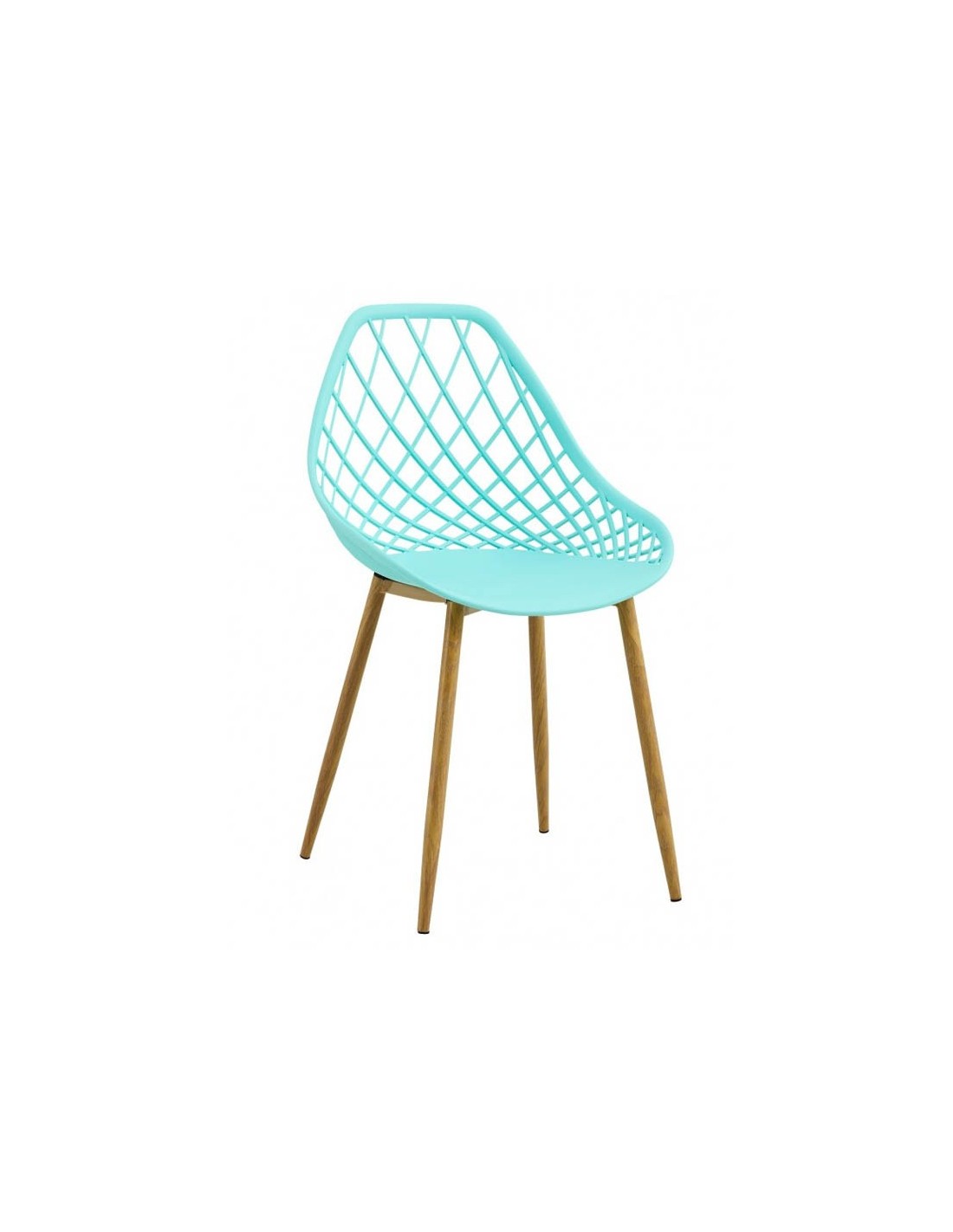 Sillón con base metálica imitación madera y asiento de polipropileno en colores pastel, es ideal para interiores y exteriores protegidos.
