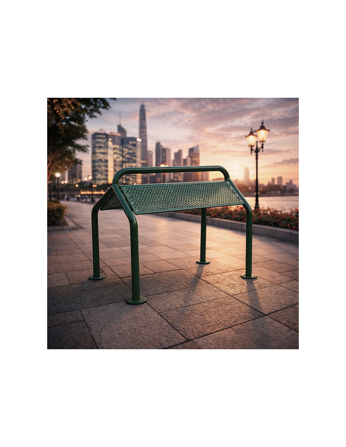 Fabricado con dos tubos estructurales 60Ø mm en acero, lacado en resina epoxi en el color RAL que elijas. Curvados y reforzados para garantizar estabilidad y resistencia. Dispone de doble superficie de descanso isquiático con chapa perforada para mayor confort y transpiración.