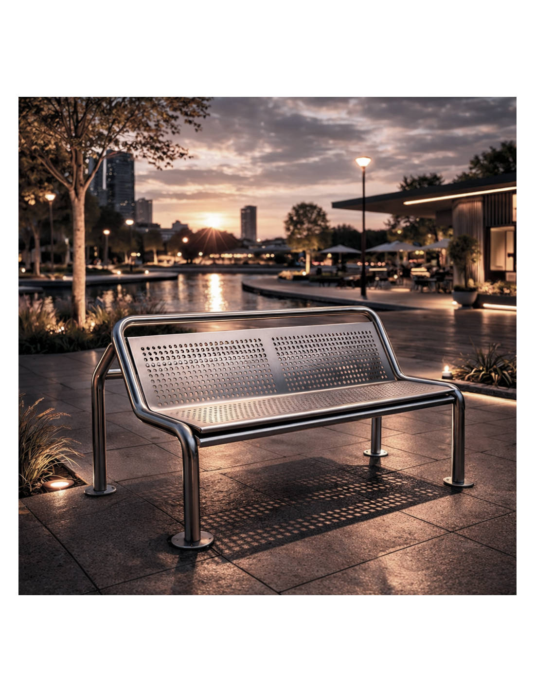 Su estructura con tubos inox curvados garantiza máxima estabilidad y durabilidad frente a la intemperie, vandalismo y desgaste ambiental. Es apto para interiores y exteriores, con alternativa en acero inoxidable 316 para ambientes marítimos o zonas costeras.
