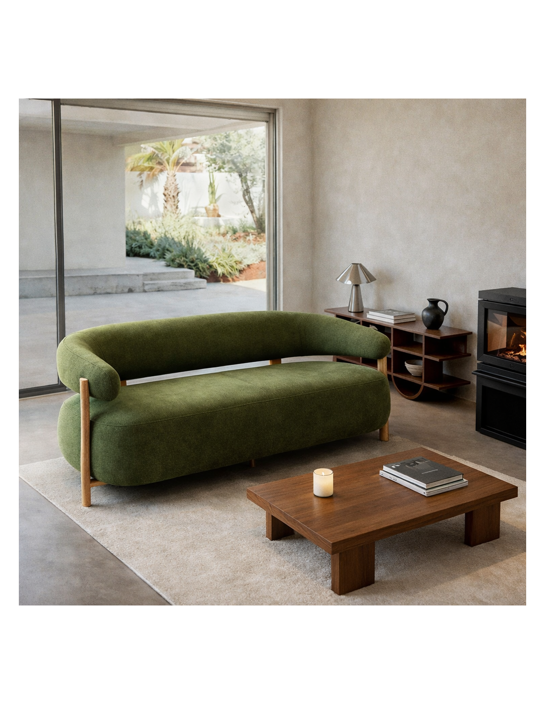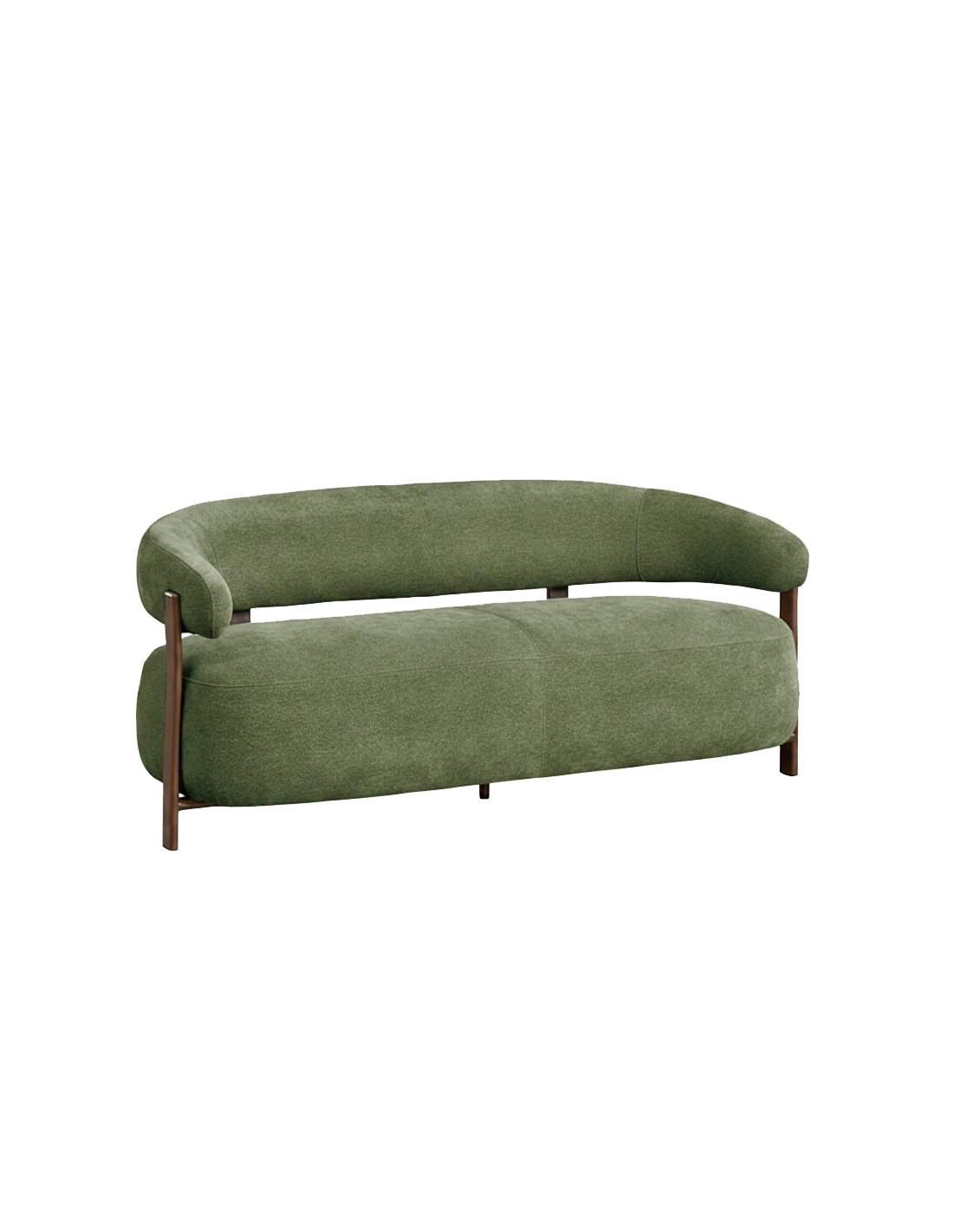 Sofá de 2 plazas con diseño envolvente y firmeza intermedia. Tapizado en chenilla verde salvia, estructura reforzada y patas metálicas efecto madera. Apto para uso interior y contract.