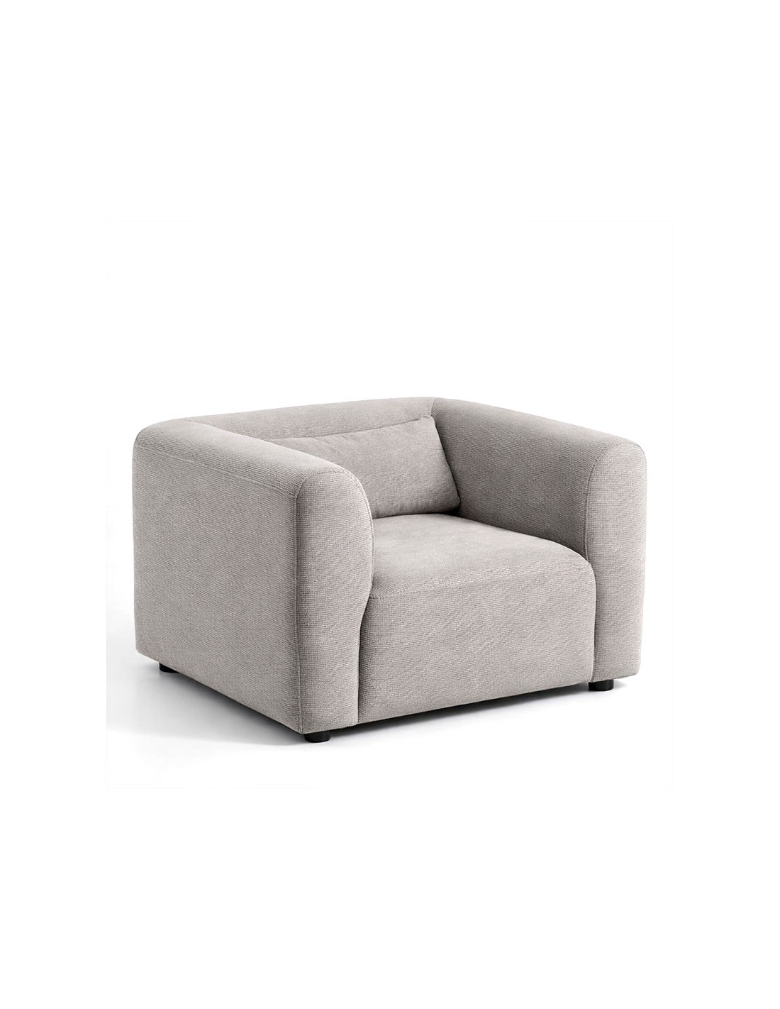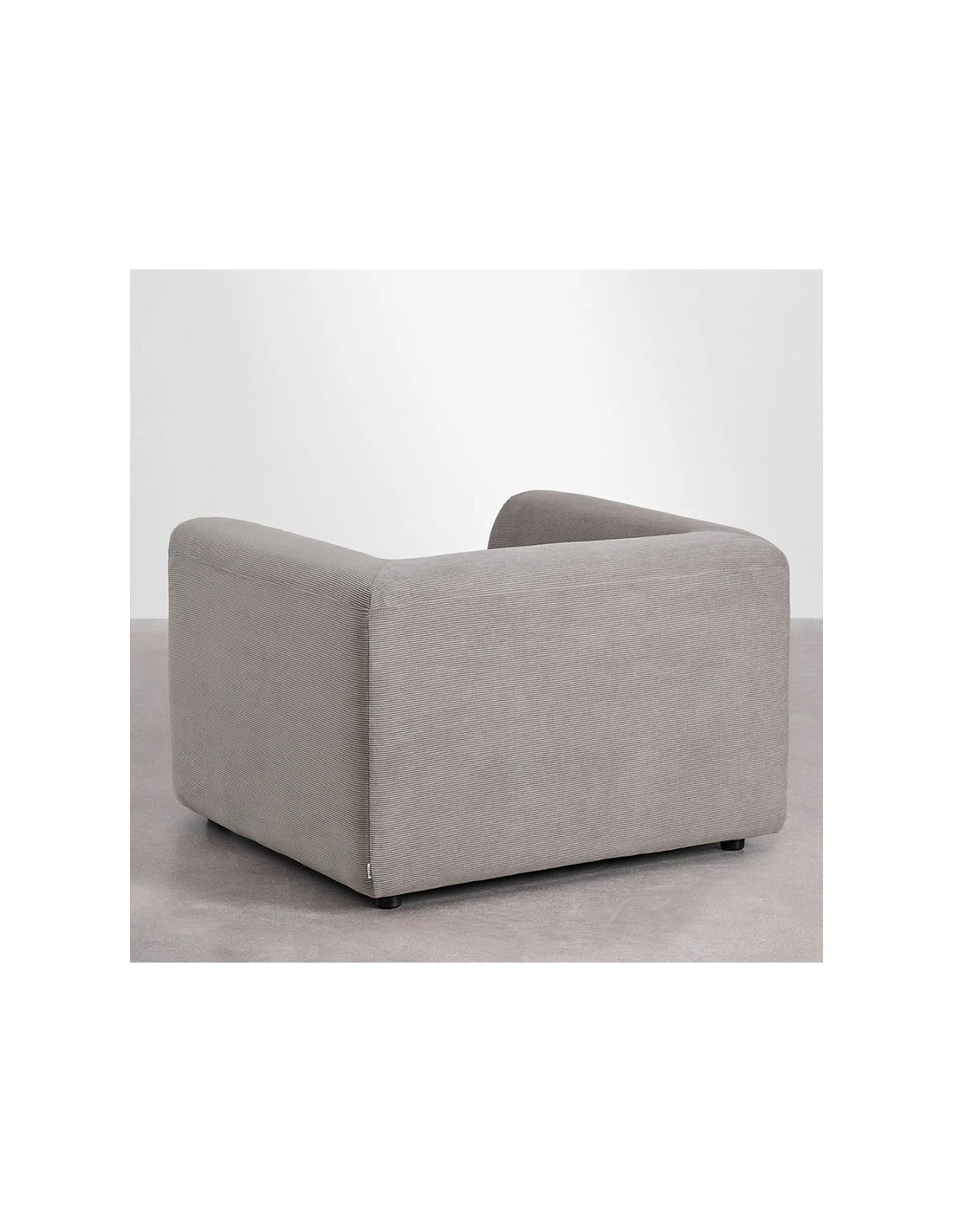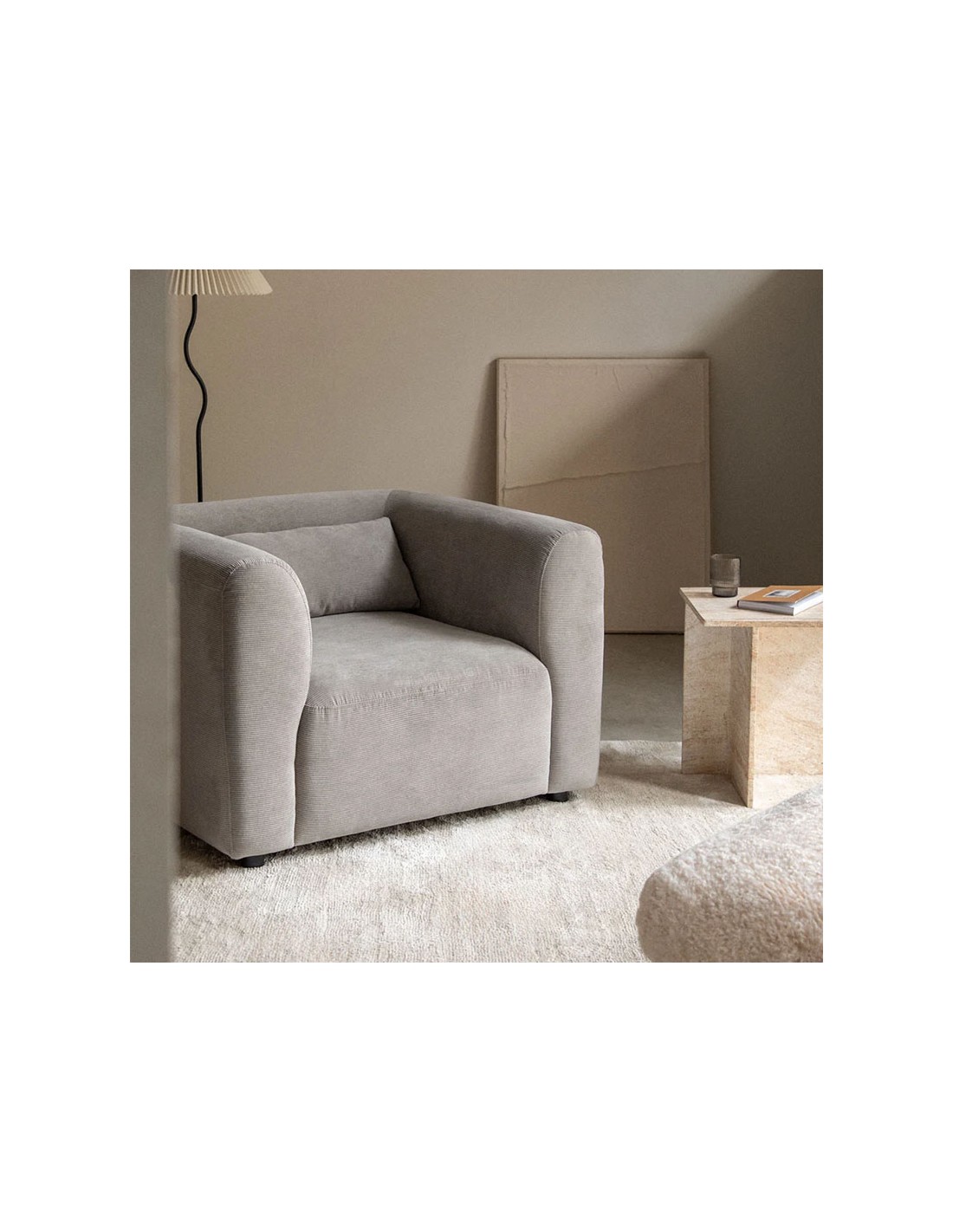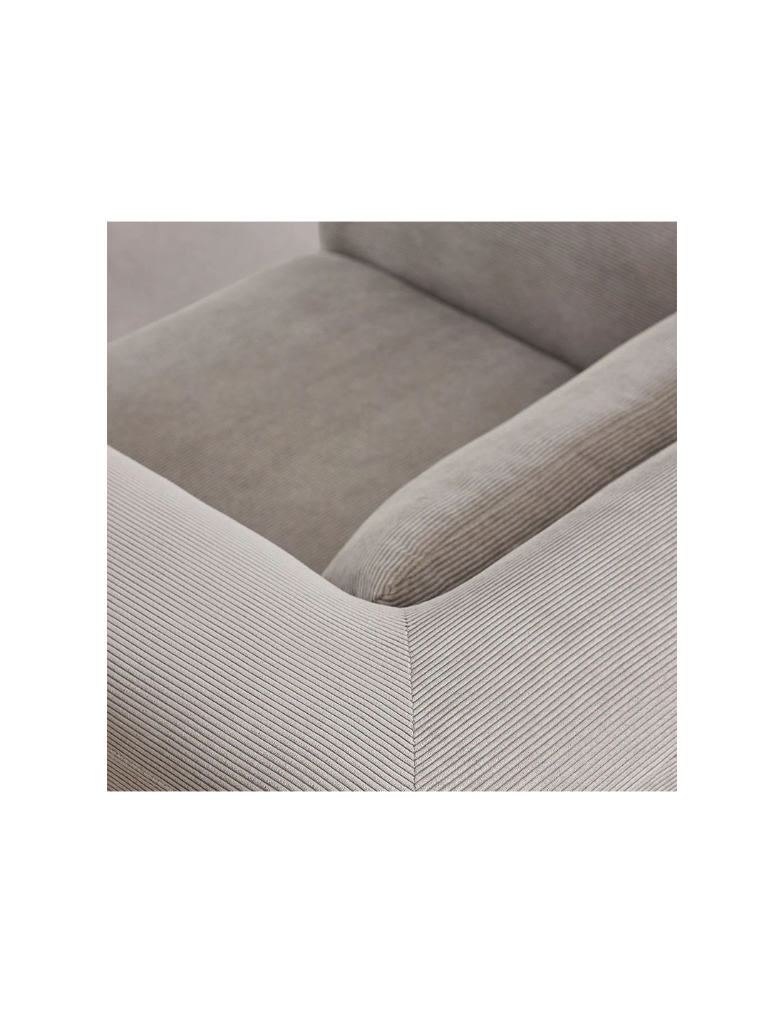 Butaca de diseño contemporáneo tapizada en pana gris topo claro, con asiento de espuma de alta densidad y sistema de muelles en zigzag. Una pieza cómoda y elegante, ideal para interiores que buscan equilibrio entre estilo y funcionalidad.